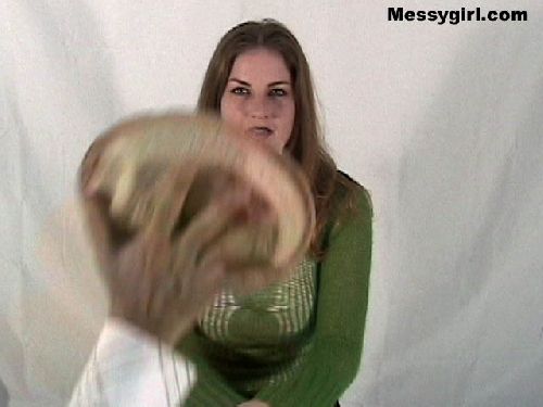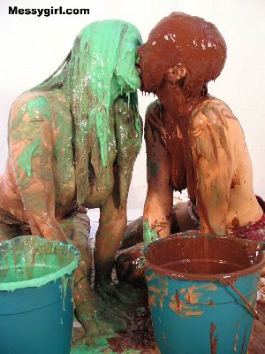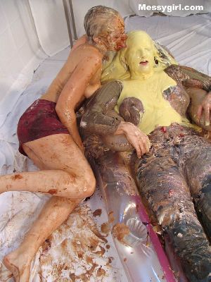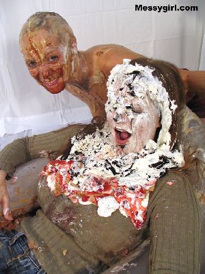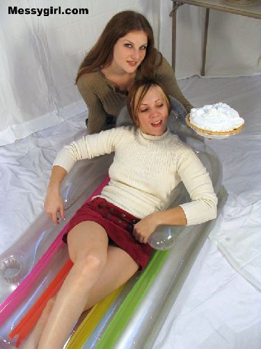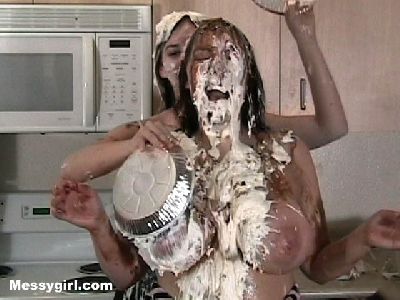 Sara and Raven meet for the first time and get into a messy tit for tat pie and slime fight. Both girls end up topless and covered head to toe!