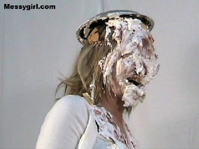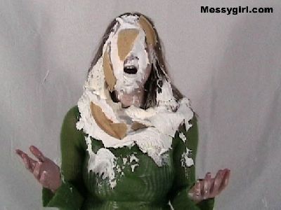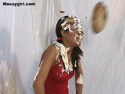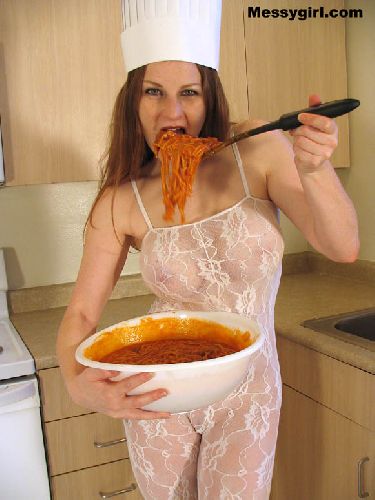 Sexy Amber pours spaghetti and meatballs, cheese sauce and beans into her body stocking. She even pours the mess on herself as well! She is then finished off with cream pies!