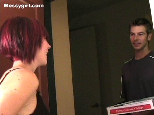 Nikki orders a pizza and has the delivery boy pie and slime her to earn a $25 tip! She even goes topless for him!