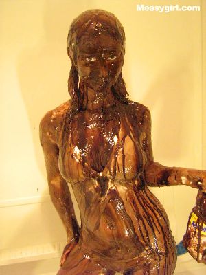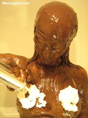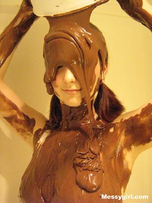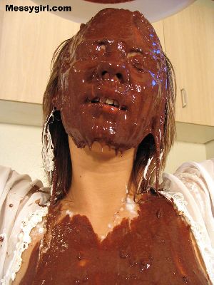 Sexy Allison is in her thin white robe, thong panties and heels. She first pies herself and then pours gallons of chocolate over her head and body. Very sexy and naughty!