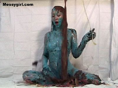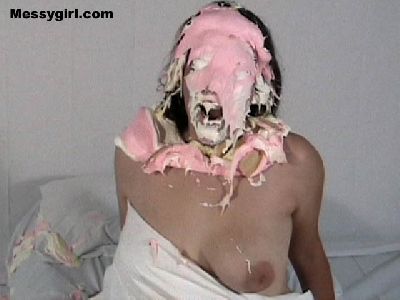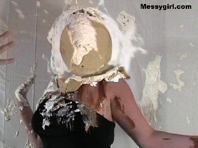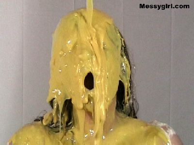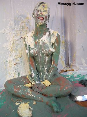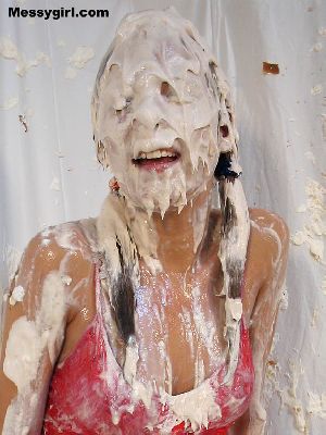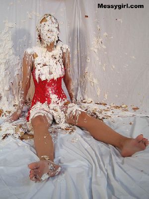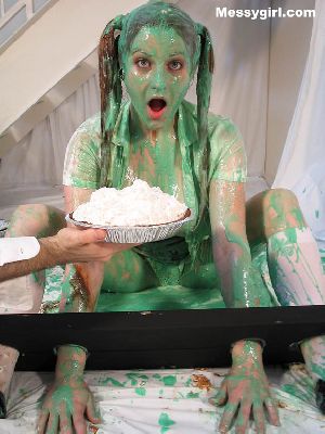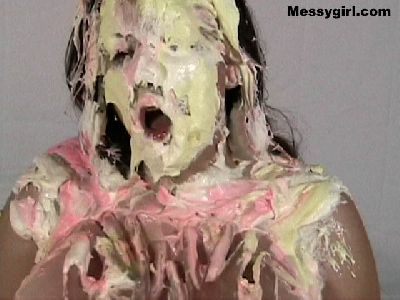 Cindy is pied and slimed for the first time. She takes on the mess like a pro! So much so that it turns her on as she rubs it all over herself.