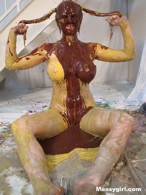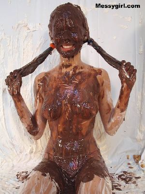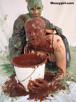 Liz is covered in chocolate and Amber is covered in peanut butter. Both girls start in the nude! They also rub it all over each other!