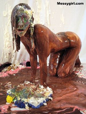 Allison is in her sexy red teddy as she is pied and then covered in chocolate batter. She goes topless and rubs it in all over!