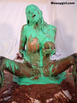 Sexy Madison is pied and slimed wearing only panties, stockings, gloves and heels.