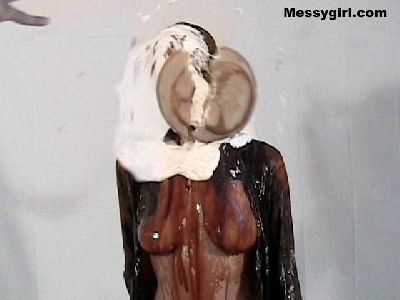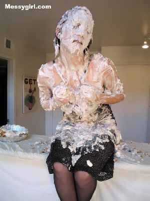Liz is covered head to toe in pies, chocolate and syrup