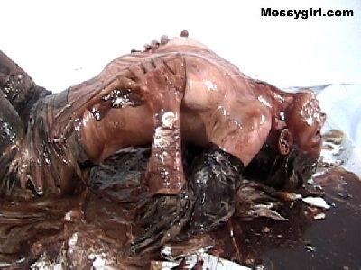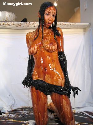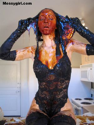 Lexi is in her sexy teddy, gloves, stockings and heels as she is covered in molasses, syrup and pies. Very messy and sticky!