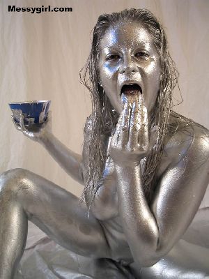 Sexy Amber is painted silver and poses like the sexy mud flap girl you seen on the back of semi-trucks. We added slippery mud to finish the effect!