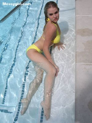 Liz is in her sexy yellow bikini as she enjoys a relaxing dip in the pool.