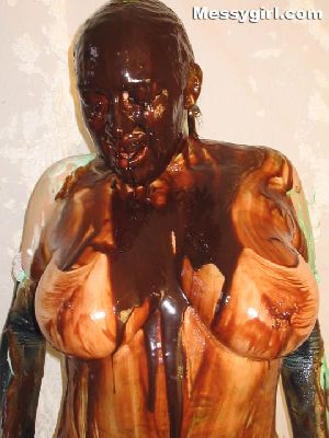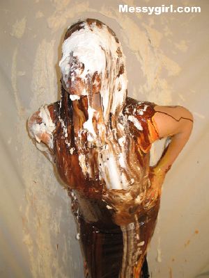 Raven enjoys her first messy session in and out of her body stocking. She is covered in pies, batter and chocolate syrup!