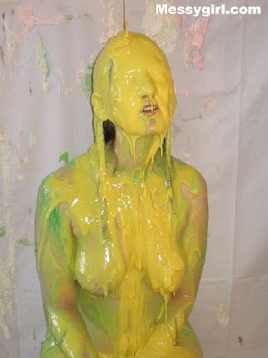 Nikki slops it up in pudding, slime and pies. She starts out in her sexy bikini, but soon goes nude for pie sitting and head dunking in a bucket of slime!