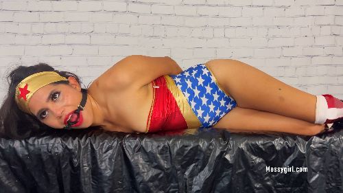 Sofia returns as Wonder-Woman and this time she has a vibrator inserted in her pussy while she is bound, gagged and covered in all kinds of slop.