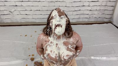 Single mom Sofia received an offer from a customer to go messy extreme and she accepted the challenge. She is handcuffed and has a open ring gag stuffed in her mouth as she takes an onslaught of sweet and savory foods.