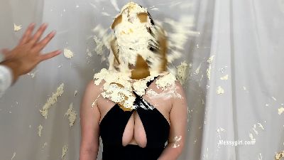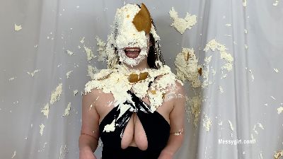 Newbie Stephanie returns and this time she is a human pie target. She is wearing a sexy swimsuit. When she says the magic words "pie me" she gets them all thrown hard at her face. During the pie throws, she takes out her big tits and rubs the cream all over them as the pies continues to obliterate her pretty face. She then pies herself and loves it.