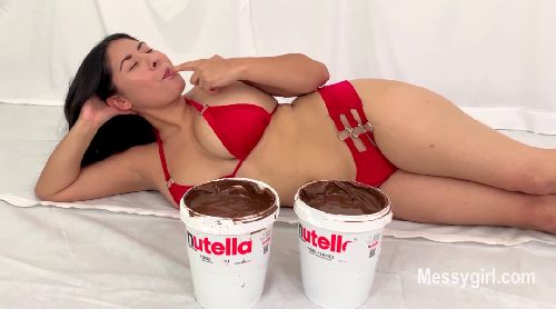MewMew does her first all nude shoot for us. So what better way than having her cover herself head to toe in nutella. She starts out in a bikini and her trademark boots as she slowly slathers herself. when she is covered head to toe, she takes off her boots and bikini. Her clean huge tits stand out, but those are soon covered, along with her ass and pussy. Now she is all nude and covered head to toe and loves it.