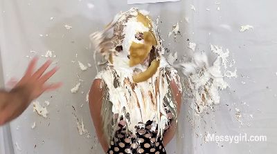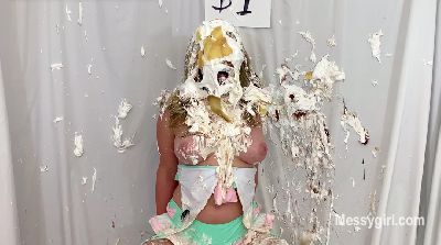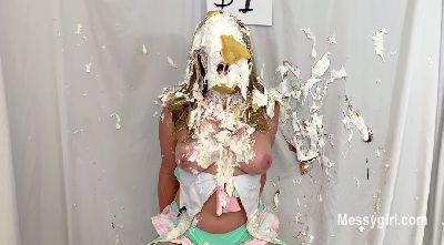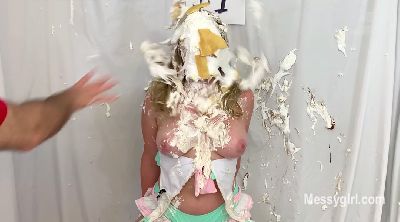 Amy is so excited to have a new job working at the carnival. She is working the pie booth, but unfortunately for her, it will be as a human pie target. Amy is in a cute bikini and her hands are tied behind her back as she sits on a stool. Amy's pretty face is soon obliterated with the hard thrown pies. She tries to keep her dignity as the endless stream of pies keep coming. Her top is pulled off to spice things up. Poor Amy can only sit there and take it. She is a head to toe creamed mess by the time her shift is over.