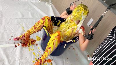 Amy is taking Zoey's food order. Zoey wants to know what the soup of the day is, so Amy tells her slut soup. When Zoey asks what the main ingredient is, Amy tells her she will soon find out. Next we find Zoey topless, sitting in a big bowl and bound to the sink. Amy is now a sexy chef and ready to pour the ingredients over Zoey. Poor Zoey wants to change her order, but it's too late, as Amy pours the savory mess over Zoey's pretty face until she is transformed into a savory blob.