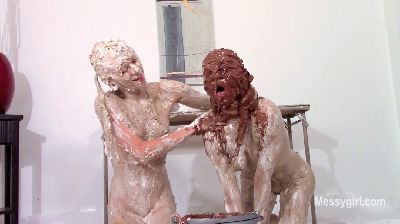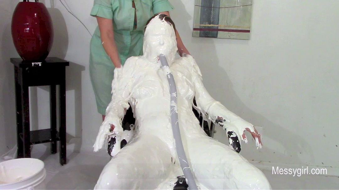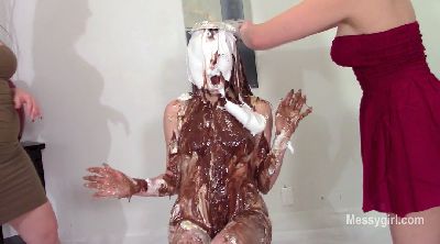 Misty is being interviewed by Amy for a maids job. But Amy finds out Misty lied about her work experiance and will tell the agency that sent her. Misty begs Amy to not tell the agency and that she will do anything because she needs the job. Well, Amy wants to teach Misty a lesson, so she takes her to the basement to have a bit of fun with her. She makes Misty strip nude and then get on the mattress so that she can tie her arms and legs together. Amy then inserts a gag in Misty's mouth. Now comes the messy humiliation. Amy smears peanut butter all over Misty's body including her face and into her mouth with the open mouth gag. Next comes dark honey over her head and this is followed with caramel syrup. Poor Misty is a total mess, but next comes chocolate syrup over her head and body. Amy then tells her to open her mouth and inserts the force feeder. Amy makes Misty swallow a chocolate shake and then scoops up the slop on the bed and feeds it to Misty as well. Amy then tells her roll around in the mess like a pig. Once Misty is done, she crawls away a humiliated mess. The good news is she got the job!