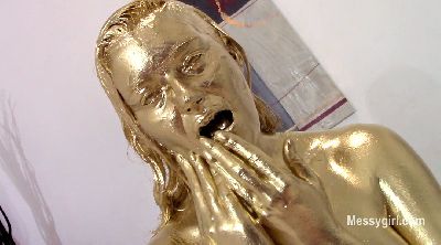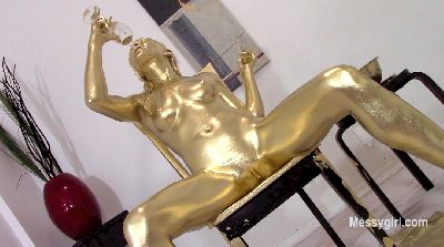 Amber exposes every inch of her sexy body as she covers herself in gold paint. Assistant Alana becomes turned on watching Amber and goes in from behind the camera and makes out with her.