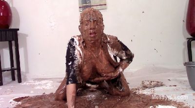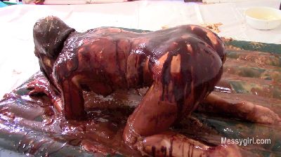 Amber wants to feel the creamy sensation of butter cream all over her body. So we give her a tub filled with pink, blue and purple butter cream. She starts out with her feet and slowly smears it up her body. She then globs it over her face and hair. She has turned into a gooey blue sky colored creature as she rubs it all over her body. Next comes a half gallon of chocolate syrup over her head. The contrast is amazing. She rubs it all over as well. She now has become a dark grey night color. The slippery mixture really turns her on. You get nice views of her sloppy pussy as the slippery mix drips from her plump pussy lips. Very sexy!
