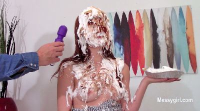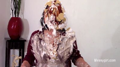 Amber is trying to resist the temptation of smashing pies in her face. She holds a pie, but places it back on the table. Then she takes it again and smashes the pie in her face. This sets her off a continuing stream of pies to her face. She never wipes her face, so she blindly reaches for the pies on the table. She becomes aroused and strips nude so she can rub the pie slop on her tits. She even pies her pussy a few times. After she has been creamed with 20 plus pies, she takes a can of whipped cream and sprays it in her mouth. After her mouth is full, she lets the cream ooze out. She finishes herself off by grinding her slippery pussy on the chair. Lucky chair!