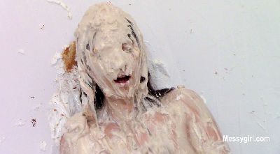Amy is selling the Messy Boat 2000 and demonstrates all the features. As she talks about the features, she is pied and slimed non stop. During her messy onslaught, the slop starts to collect in the seating area around her. The receptacle at the end of the boat starts to fill up from the slop. Once filled, she proceeds to dunk her head in it. She then spread her legs and places her feet into the built in stirrups for more over the head pours. You get a nice view of her exposed pussy as the slop pours over her face and between her legs.