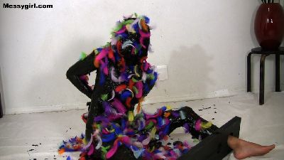 Alana is very excited to do her first custom, until she finds out it`s tar and feathers. But since it's a custom, she needs to do it. She is stripped down to her bikini, gagged, put in ankle stocks, and her hands are tied behind her back. She then has a bucket of black grease dumped over her head. The grease is then smeared all over her body and face. Once that is done, the colorful feathers are poured over her. You will enjoy the transformation,