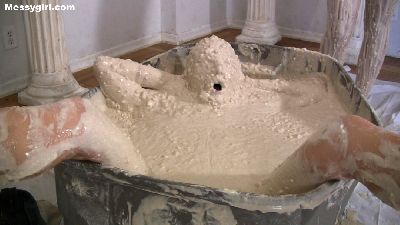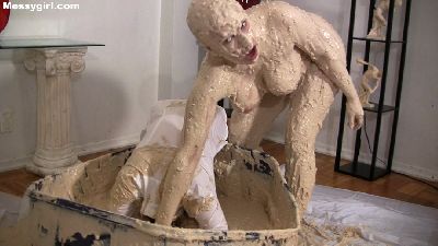 Sexy Vika is pied and slimed while tied to a chair. She then begs to be set free so that she can strip nude and play in the slop on the floor.