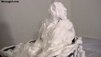 Vicky takes a bath in a 50 gallon tub filled with shaving cream.