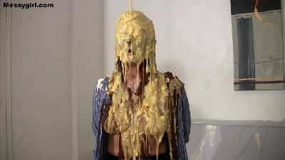 Cute Lucy is gagged, tied to a chair and wearing nipple clamps. Then she has treacle slowly poured over her head until her face is engulfed in the thick sticky stuff.