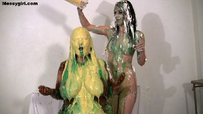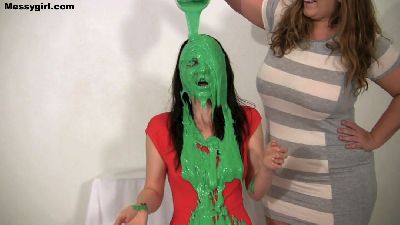 Vicky and Penelope play a game of pie, slime or strip. Both girls have a blast as they get each other messy.