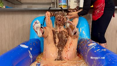 Soccer mom Breanna is back for more messy humiliation, this time at a charity event. She ends up nude, bound and destroyed head to toe in slop. She also has a funnel shoved in her mouth for a force feeding.