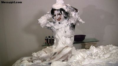 Hannah Perez is wearing a mess top and thong panties as she dives face first into a bed of shaving cream, She rolls around and strips nude until she is covered head to toe, Then she goes face first in chocolate batter.