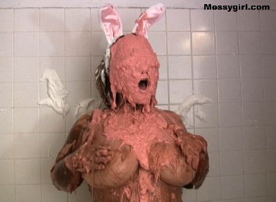 Vicky is a nude naughty bunny as she is pied and slimed.