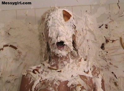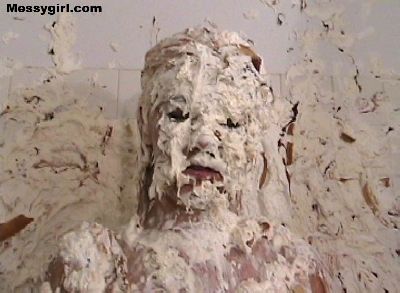 Busty Mai's relaxing shower turns into a pie attack. Mai is creamed head to toe.
