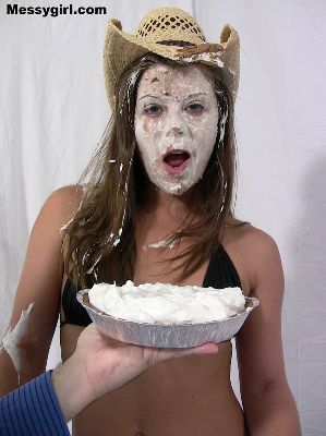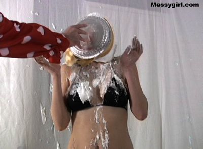 Sexy Christina returns and this time she brings her friend Titania. Both girls are in bikinis as a tit for tat pie fight breaks out. They end up nude and even play around in the left over pie slop.