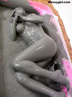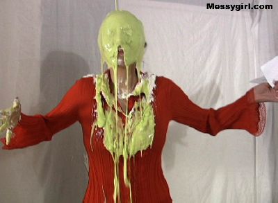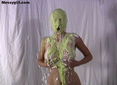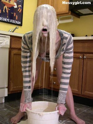 Sexy Angela takes on gallons of batter slime as she sits nude in the bath tub. Her pretty face is engulfed in the thick mess.