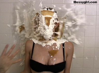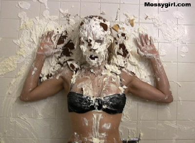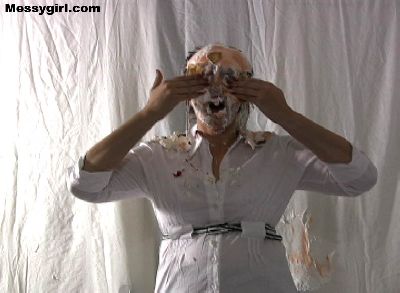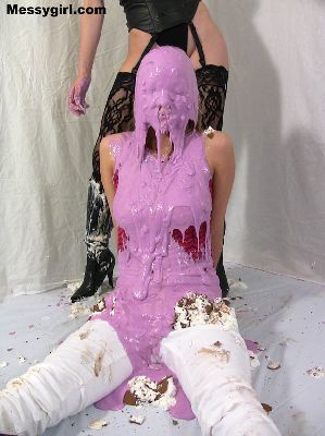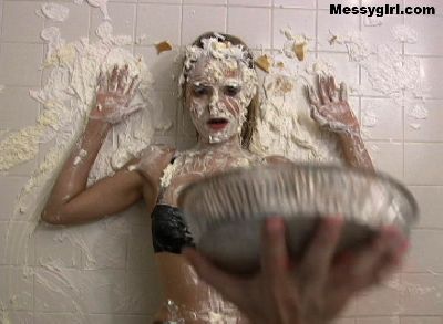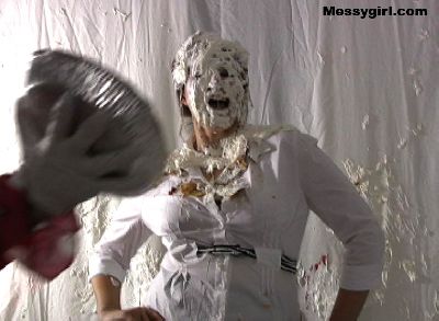 Mistress Liz breaks in a new messygirl. WAM virgin Amy gets a nice dosage of pies and batter while in the stocks. Total coverage!