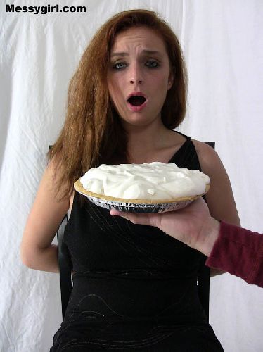 Bondage model Ashley Graham does her first shoot for us. We tie her up for some pie and batter action. Then she is set free to play in the mess.