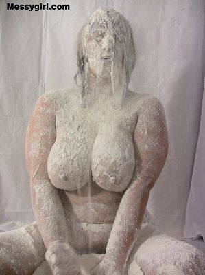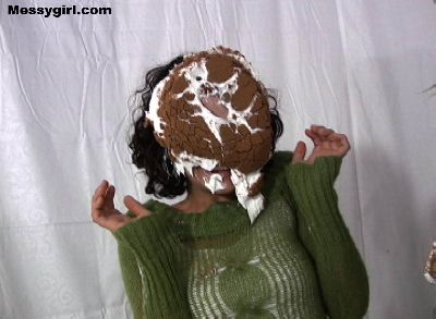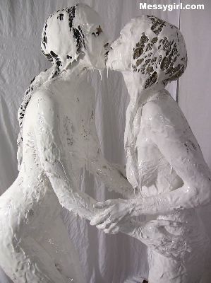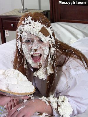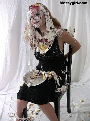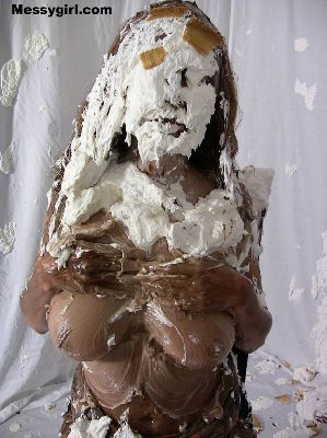 Vicky is in her white satin pajamas as she gets the messygirl treatment. Total coverage!