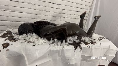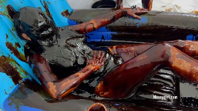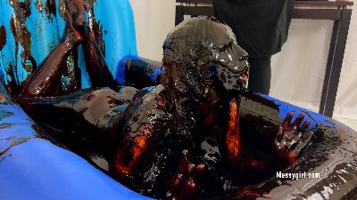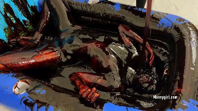 Sexy Sofia is covered in grease and feathers