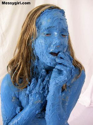 Cute Mallory does her very first messy shoot for us. She is covered head to toe in blue butter cream icing and tops that off with a chocolate syrup facial. Clothed to nude!