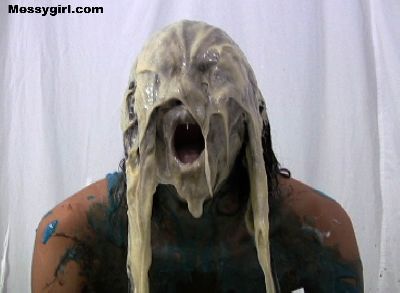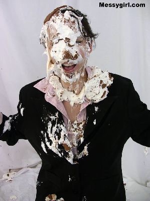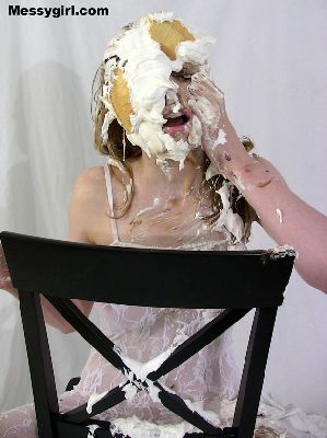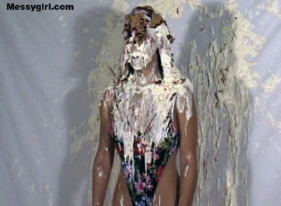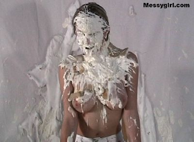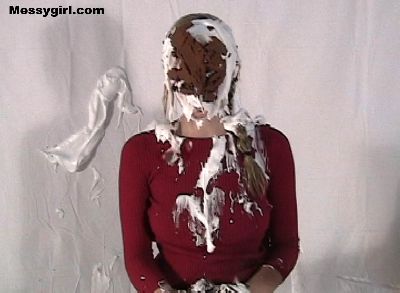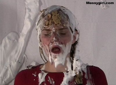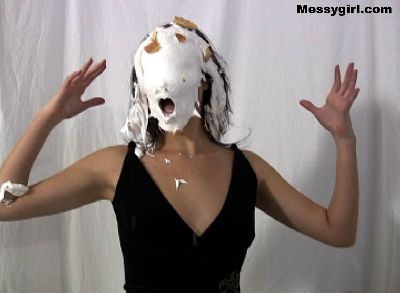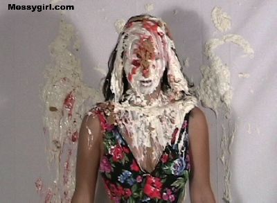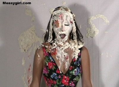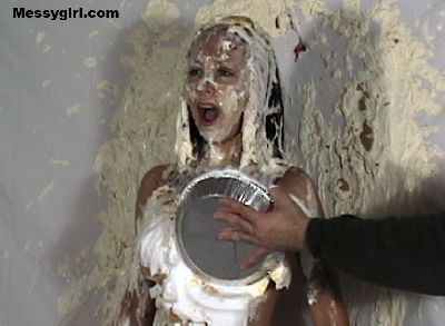 Lane's relaxing shower turns into a pie attack. She takes the pies hard to the face. She then gives in and plays in the pie mess.