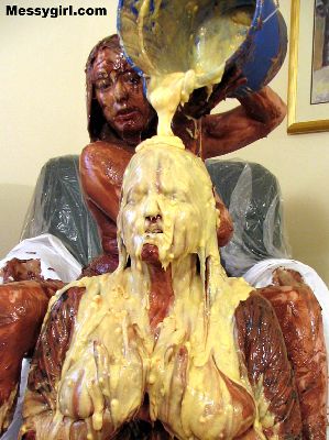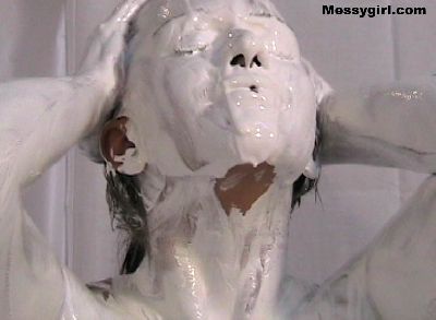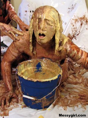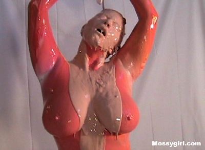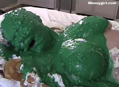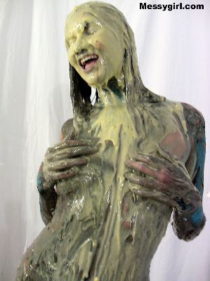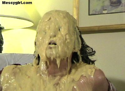 LIz gets the messygirl treatment wearing jean shorts and a bikini top. She ends up nude and covered head to toe in the mess.