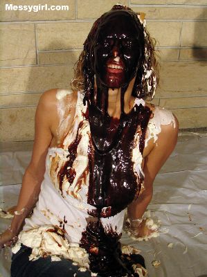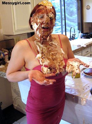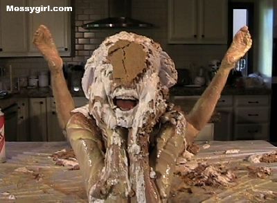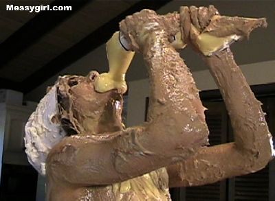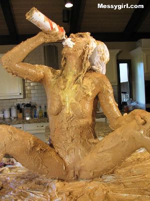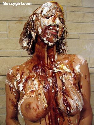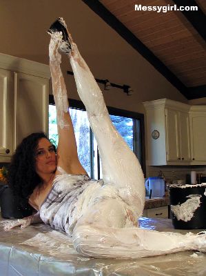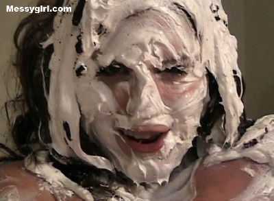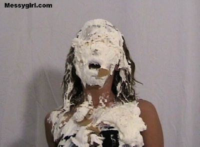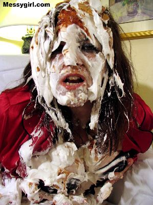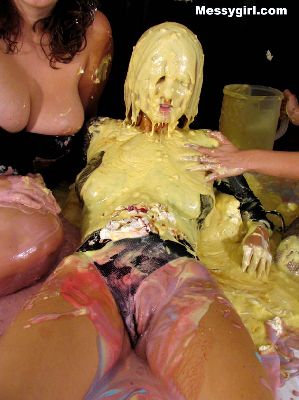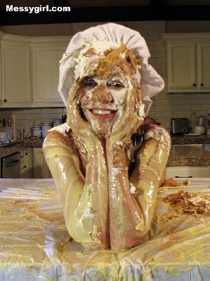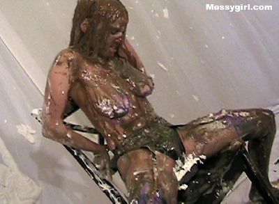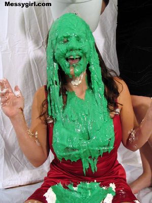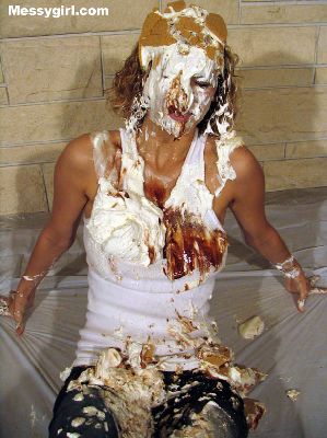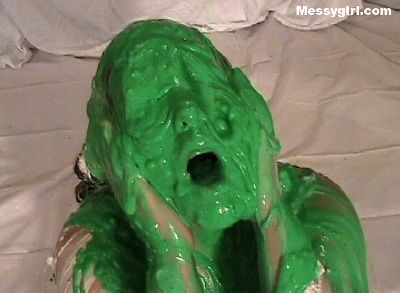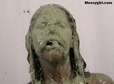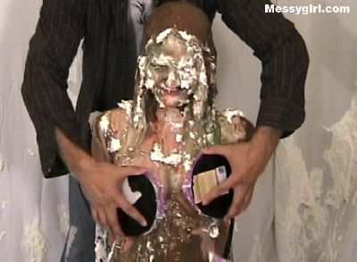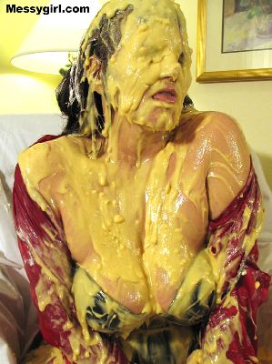 The original Messygirl is in her silk PJs as she is pied and slimed. She makes sure to smear the mess all over herself and even gives her huge tits a good rubbing,