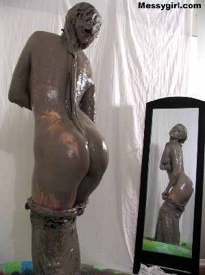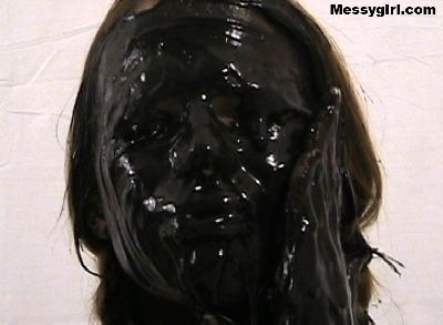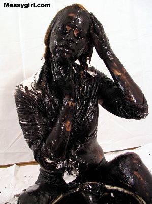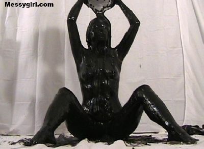Sexy Cami is covered head to toe in thick black sludge. Clothed to nude.