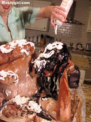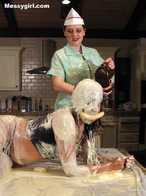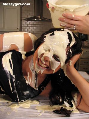 Liz and Vicky give Danielle her Messygirl initiation. Poor Danielle is covered in pies, syrup, molasses, batter and has ice cream poured on her pussy! Liz and Vicky do join in for some messy play time as well.